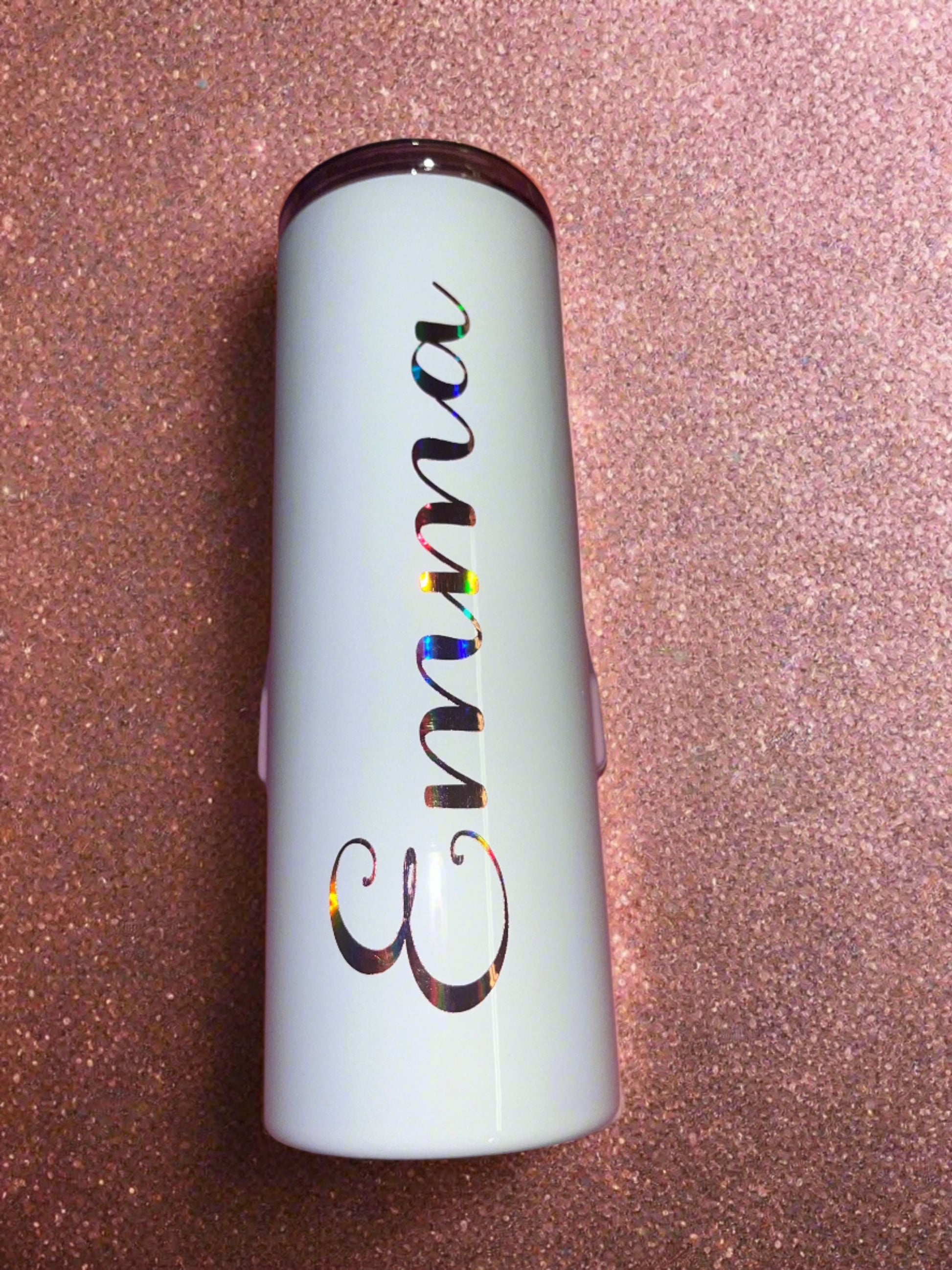 Customize your own 20oz skinny tumbler with a custom name! Keep your hot and cold drinks insulated in style. Comes with a straw and lid for easy sipping on-the-go. Just leave your name and preferred vinyl color in the notes when ordering. Stay hydrated (and trendy) with your personalized tumbler!