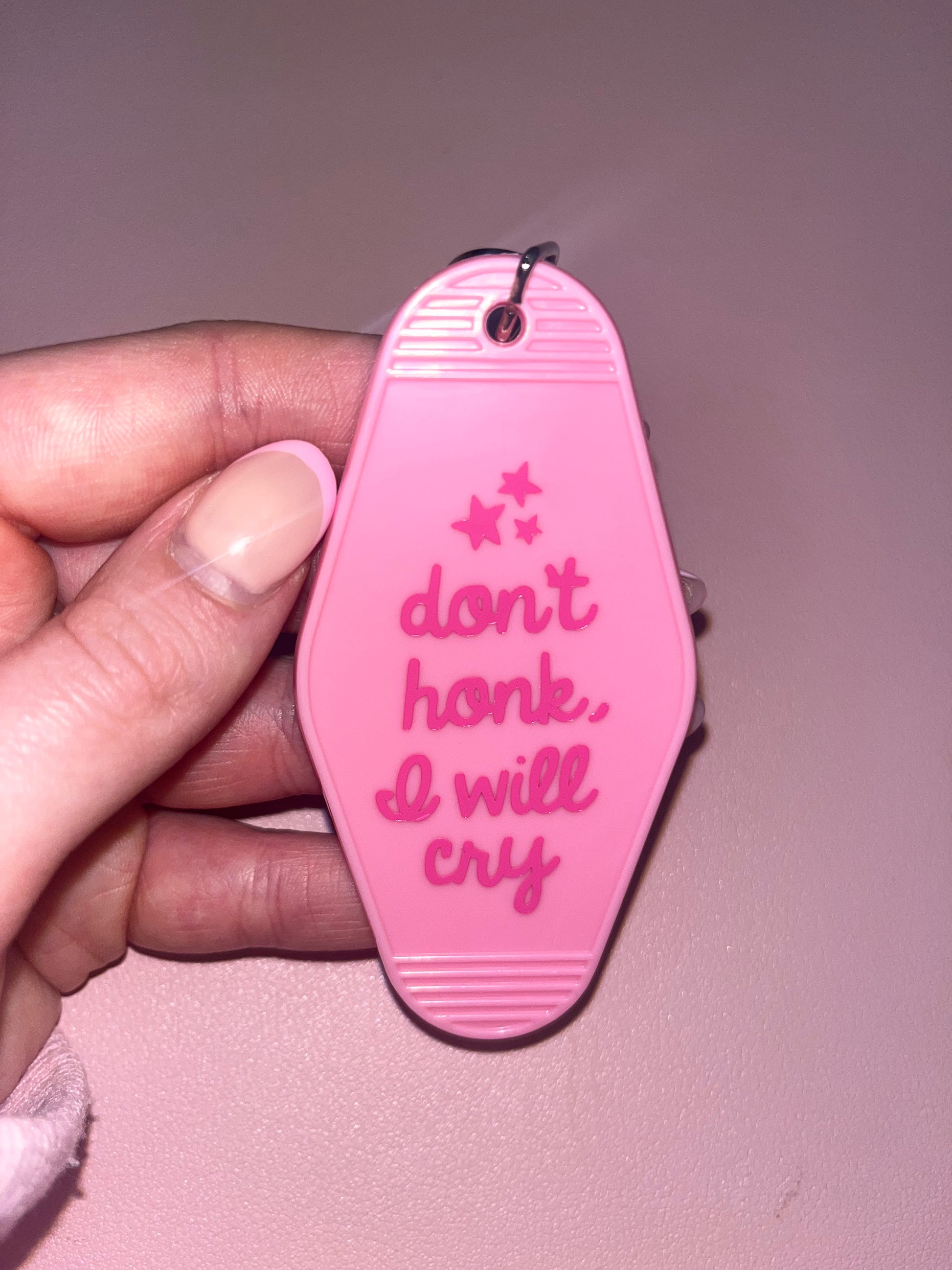 "Keep your car horn quiet with our Don't Honk I Will Cry😭 Motel Kechain💕! Featuring a tearful reminder to be mindful of noise levels, this keychain adds personality and prevents unnecessary honking. A playful way to express yourself while maintaining some peace and quiet. No tears necessary! 😉"