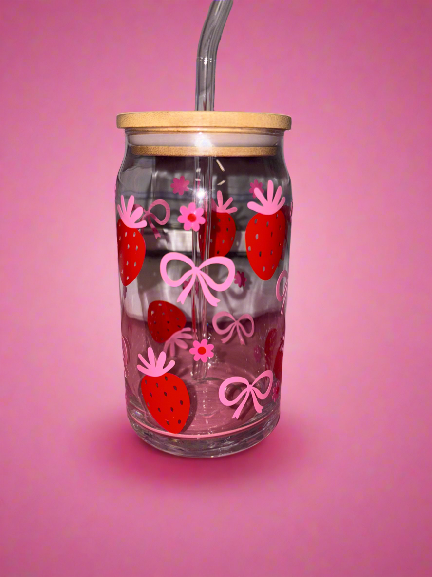 Quench your thirst and add a touch of whimsy with our Strawberry and Bow Glass Can. Perfect for sipping on-the-go, this playful design features a bright strawberry and charming bow. Say goodbye to boring beverages (and hello to double the fun!) with this quirky and eye-catching glass can.